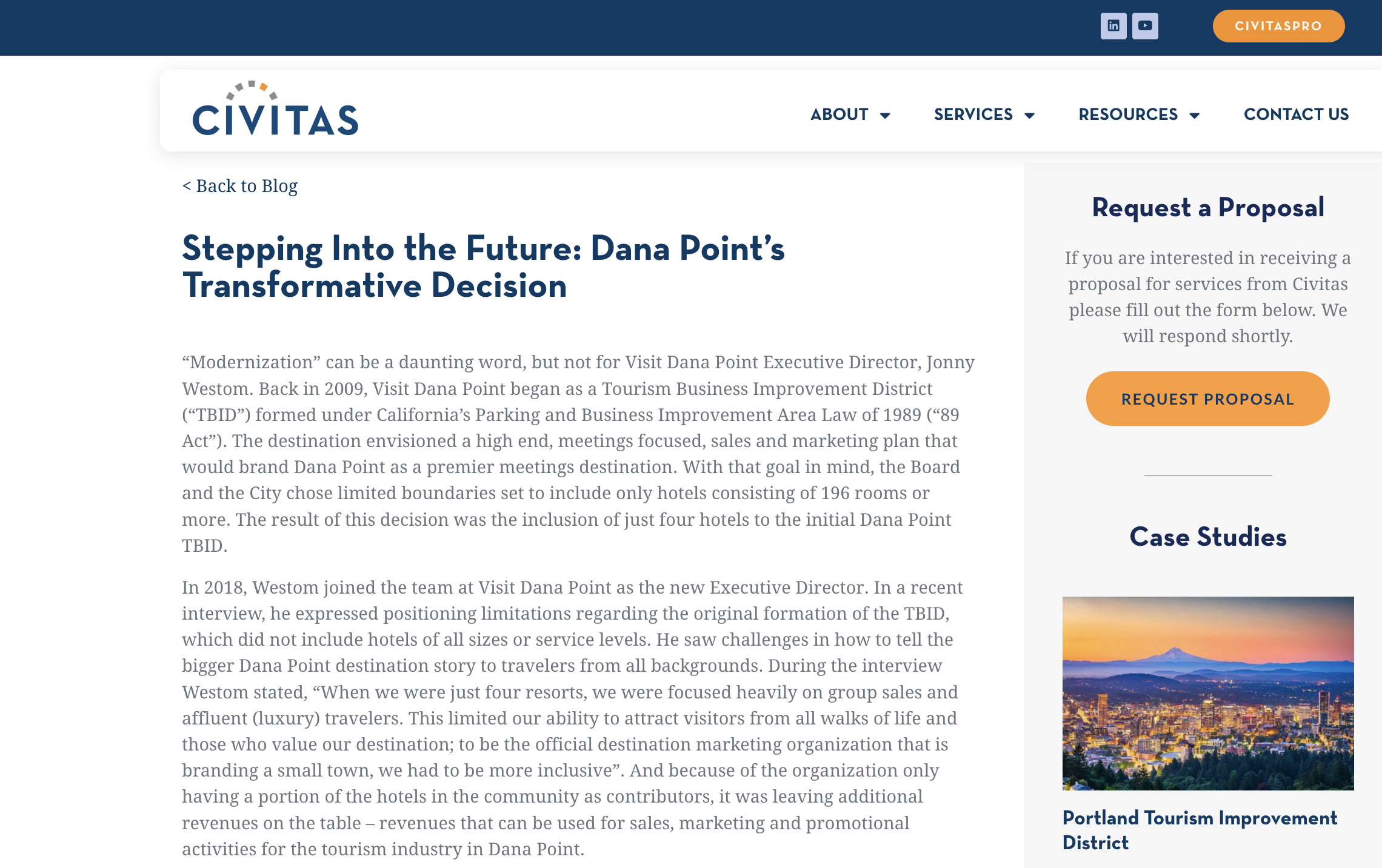 Civitas is a leading international firm specializing in the research and implementation of tourism-related levies. Based on an interview I conducted with Visit Dana Point’s Executive Director, this article explores the positive impact of Dana Point’s 2009 decision to become a Tourism Business Improvement District (TBID) through Civitas. The goal was to highlight Dana Point’s success and encourage other Destination Marketing Organizations (DMOs) to consider this approach.
